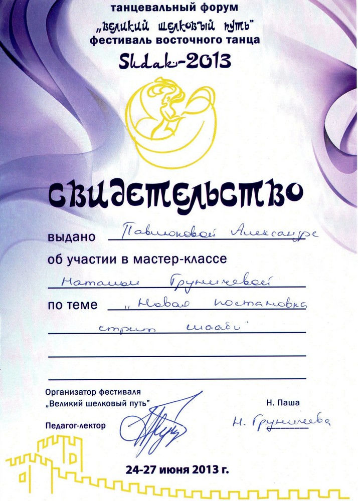 Участница и призер республиканских и международных конкурсов и фестивалей, танцовщица из основного состава ШВТ "Азали". Обладатель национальных сертификатов по восточному танцу. Помощник руководителя школы восточного танца "Азали". Руководитель коллектива восточного танца "Джамаль".